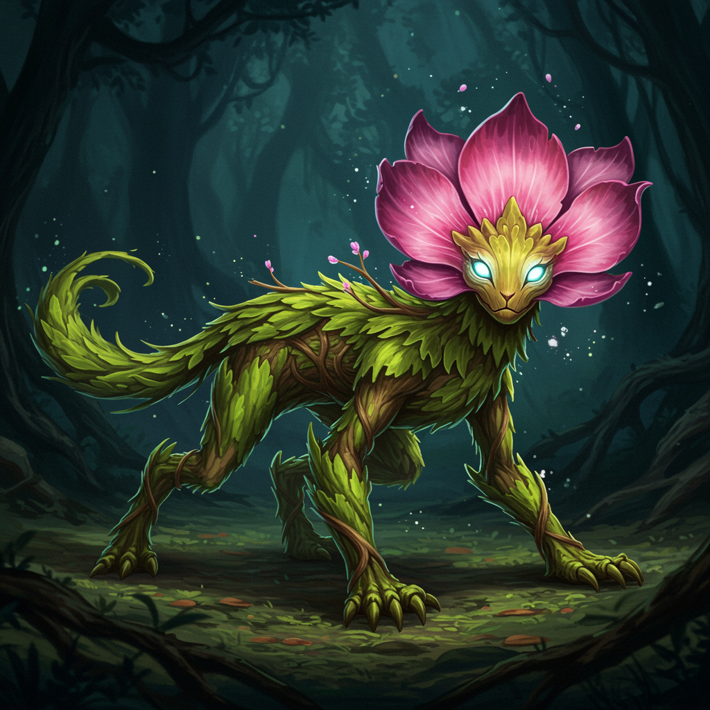 The Florent is a mesmerizing hybrid creature, a fusion of flora and fauna, its body a tapestry of soft, verdant leaves intertwined with delicate branches that overlay a thin, bark-like skin. This unique skin shimmers subtly under moonlight, offering a hint of its mysterious origins. Its four elongated paws, each covered in lush, emerald foliage, enable nimble movements across the forest floor, while its retractable, thorn-like claws allow for swift capture of prey and adept climbing. The Florent's head is an enchanting bloom, with petals that change hues from soft pinks to deep purples as the creature matures. Nestled within this floral visage are two luminescent eyes, their glow offering keen sight in shadowy environments. Its acute sense of smell is housed within its pistil-shaped snout, allowing it to track elusive prey and navigate its surroundings with precision. Though the Florent lacks endurance for prolonged travel, it exhibits a remarkable adaptability; by spreading its expansive leaves, it harnesses the wind to glide gracefully across distances. When stationary, it can extend subterranean tendrils to root itself in place, drawing sustenance from the earth. Its existence is a delicate balance of plant-like tranquility and animalistic agility, an awe-inspiring testament to the wonders of evolution.