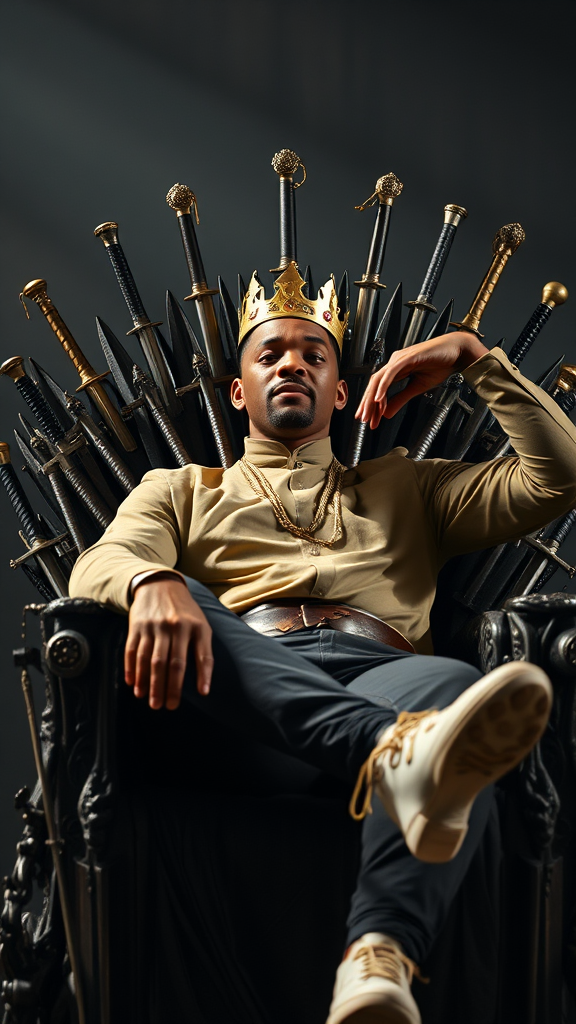 The Fresh Prince of King's Landing featuring Will Smith in a tilted crown, casually lounging on a throne made of swords, dramatic cinematic lighting casting shadows, a unique mashup capturing the essence of Game of Thrones and Fresh Prince of Bel Air in a vivid TV still, blending modern urban style with medieval grandeur, showcasing a confident and playful royal demeanor.