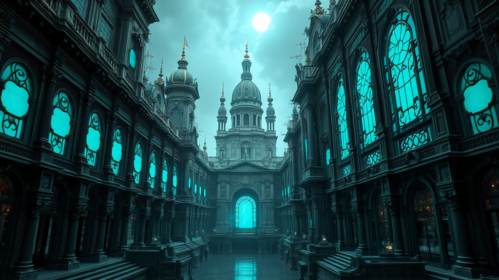 The gallery's pinnacle, inspired by Oliver Wetter and Alberto Seveso, embodies a cyberpunk dystopia with stunning dark bronze and vibrant cyan tones. Featuring intricate architectures reminiscent of Artemisia Gentileschi's brilliance, the scene is draped in a palette of dark gray and light aquamarine. The fusion of styles and colors crafts an otherworldly ambiance, merging classic and futuristic elements in an expansive and mesmerizing tableau.