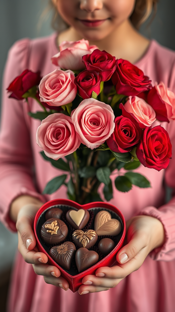 The girl cradles in one hand a bouquet of roses, their fragrance enchanting and petals a symphony of velvety hues, from soft blush to rich crimson. In her other hand, she carries a heart-shaped box filled with intricately designed chocolates, each piece a tiny masterpiece, bursting with indulgent flavors that irresistibly melt away.