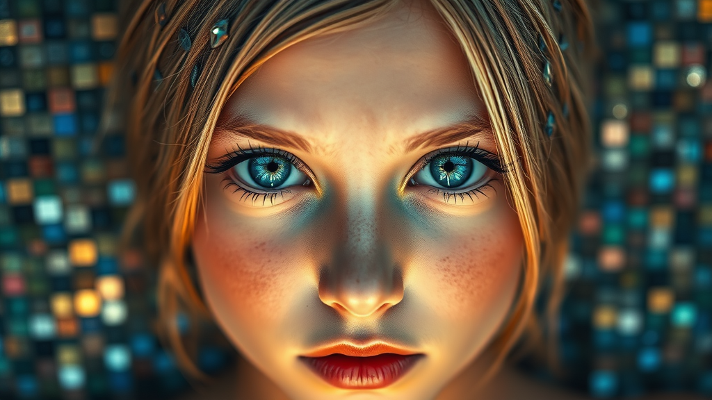 The girl possesses captivating blue eyes surrounded by a sea of mosaic tiles, each piece detailed and intricate, bursting with full color. The scene is cinematic and dramatic, bathed in a glowing ambient light that highlights the sharp and highly coherent composition. Rich and surreal, the design features striking symmetry and elaborate patterns that create an epic and professional aesthetic. It’s an awesome display of artistry, dynamic and vibrant, with deep, fantastic colors that make it truly iconic and stunning.