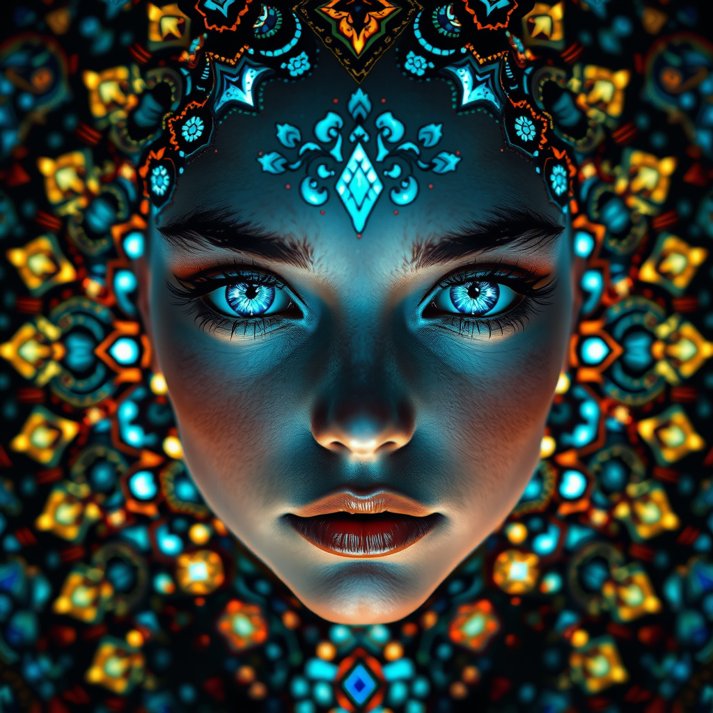 The girl possesses mesmerizing azure eyes and an abundance of intricate mosaic tiles, detailed and vivid, exuding a cinematic and dramatic ambience. Her presence is remarkably coherent and sharp, accentuated by complex and glowing designs that are striking and stunning. The scene is rich in surreal elements, elaborate and epic, with a professional and fine artistic touch. It's an awesome and dynamic display, vibrant and fantastic, with iconic and deep colors creating an unforgettable, symmetrical masterpiece.