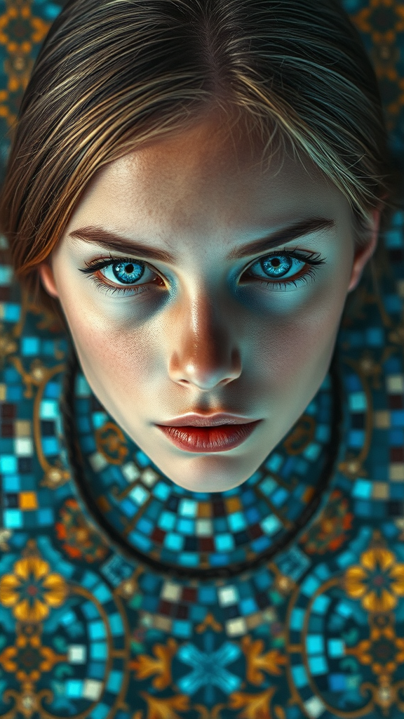 The girl possesses mesmerizing blue eyes and is surrounded by a myriad of intricate mosaic tiles; the scene is detailed, vibrant, and cinematic, enveloped in dramatic ambience. It maintains a high level of coherence with sharp, radiant, and stunning visual elements. The tiles form a visually striking and symmetric design, with each piece seemingly telling its own story. The atmosphere is rich and surreal, yet epic and finely tuned, offering a blend of dynamic artistry and vibrant colors. The composition evokes an iconic and fantastical quality, with deep hues that enhance its professional and awe-inspiring character.