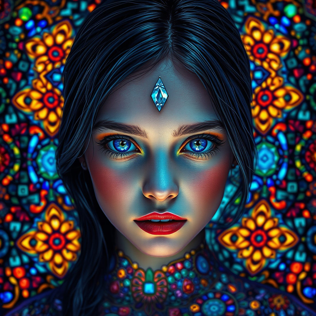 The girl possesses sapphire eyes, surrounded by an array of vibrant mosaic tiles, exquisitely detailed and intricate. The scene is full color, with a cinematic and dramatic ambiance. The composition is highly coherent and sharp, filled with complex, glowing patterns that are stunning and striking. Symmetry flows throughout, weaving rich, surreal, and elaborate designs. The visual narrative is epic, professional, and artistically dynamic, with vibrant, fantastic, and iconic elements. It features deep, resonant colors that paint a stunning portrait of thought and creativity.