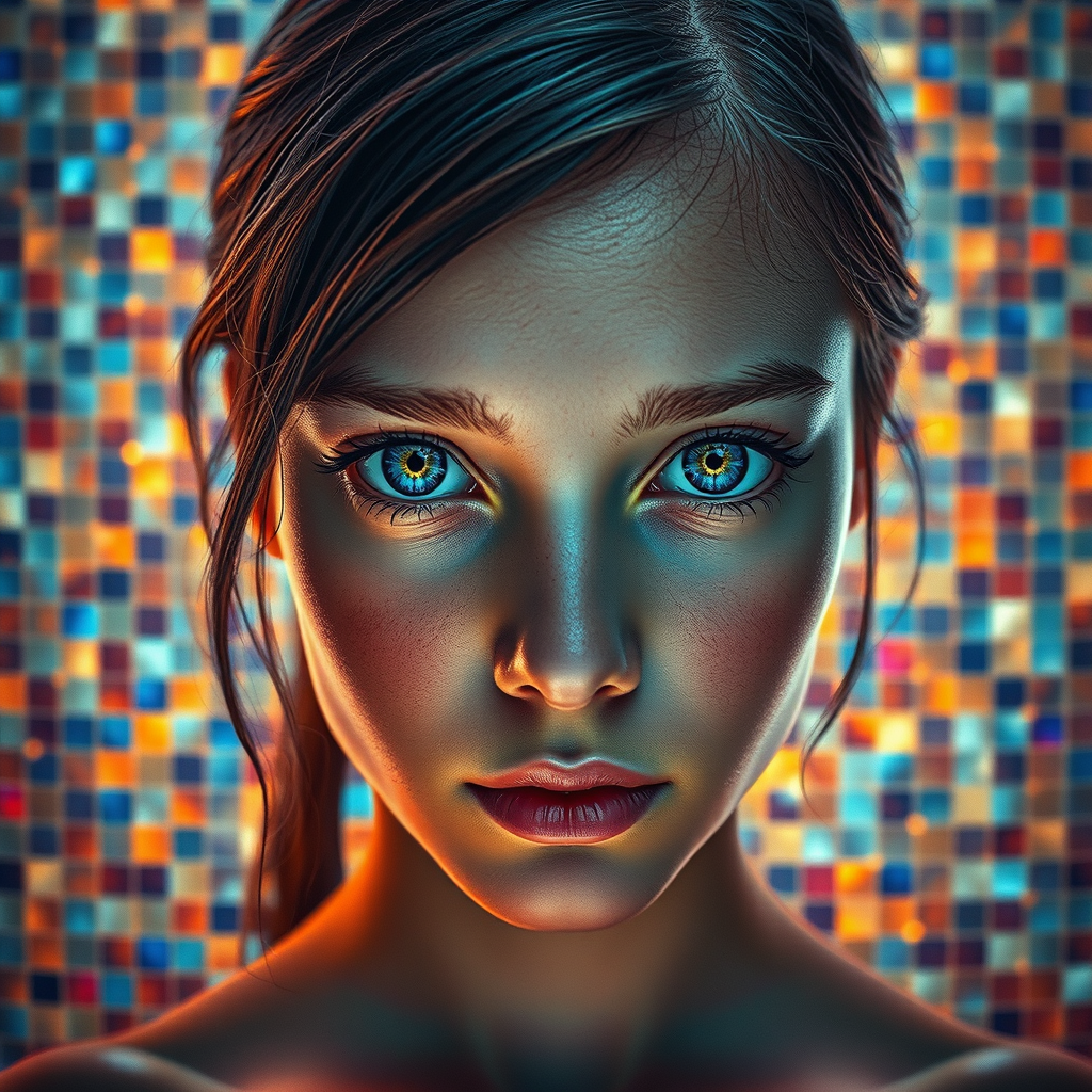 The girl possesses striking blue eyes, surrounded by an array of intricate mosaic tiles. Each tile is detailed, showcasing a full spectrum of vibrant colors that blend seamlessly into a cinematic and dramatic ambiance. The scene is highly coherent and sharp, with a complex interplay of glowing light that adds a stunning, surreal quality to the overall composition. The image is rich with thought, displaying a remarkable and elaborate symmetry that is both epic and professional in its artistry. The dynamic, vibrant scene captures the imagination, boasting iconic and fantastic deep colors that leave a lasting impression.