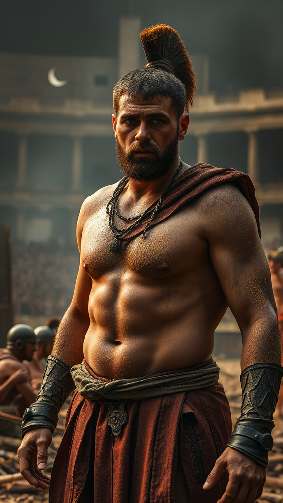 The gladiator stands amidst the remnants of the arena, his eyes wide with fear and horror etched deeply into every line of his weary face. His body, a canvas of exhaustion and bruises, tells tales untold. Grains of sand cling to his skin, blending with rivulets of sweat to form a gritty testament to the unforgiving battle. The atmosphere around him is a cloak of oppressive darkness, thick with the haunting echoes of combat. In the aftermath, the scene demands a hyper-realistic representation, where each detail—every scar, every grain of sand, every droplet of sweat—is enhanced to vivid sharpness and contrast, capturing the brutal reality of survival. Subtle creative touches infuse the scene with life, yet the core essence of struggle and endurance remains untarnished.