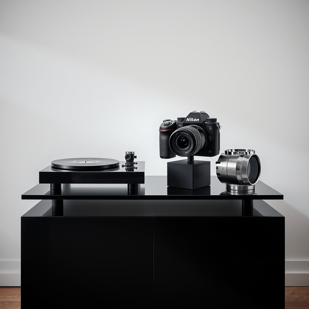 The harmonious union of innovative design and photographic precision gives birth to a visually striking centerpiece. A gleaming Dieter Rams' Braun SK4 record player sits atop a glass-topped, black minimalist console, its mechanical components a stark contrast against the flawless, crystal-clear backdrop of a freshly polished aluminum surface. Adjacent to the record player, Snow White's ethereal beauty is reflected in a curved, cylindrical jimenez created from a mirror-polished stainless steel, subtly curved and sculpted to an angular silhouette, as if emphasizing the beauty of light. Suspended within this minimalist universe, the Nikon Z9 camera stands like a sentinel of versatility, balancing effortlessly on a matching black console, its matte surface adding a tactile intimacy to an otherwise sleek profile. Next to the camera, the NIKKOR Z 50mm f/1. 2 S lens is poised for action, its fluid curves and purposeful lines evoking a sense of readiness, the polished chrome of its barrel vibrating gently against the calm, solid color of the background, creating an optical warm dialogue with the crisply outlined art piece in the corner - A miniature sterter sheet scaled up 100fold standing tall like the triumph of modern Minimalism.