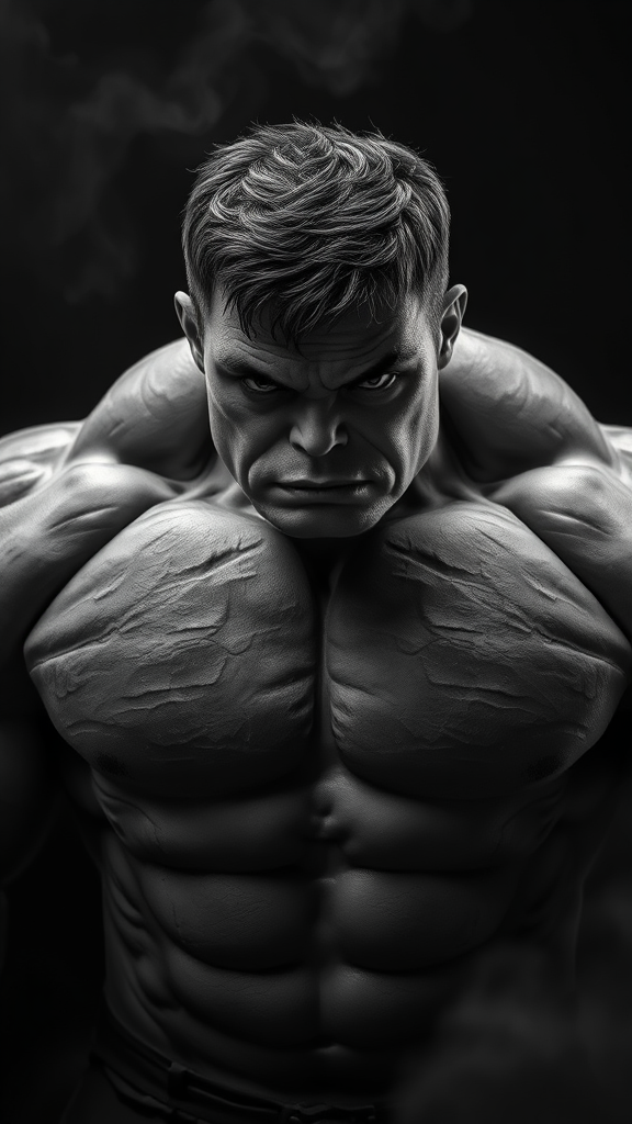The Hulk superhero captured by photographer Lee Jeffries, featuring expressive eyes and set against a dark background; emphasizing a proportionate physique with photorealistic attire. The image showcases extreme detail and high contrast, processed in HD and HDR with ray tracing and subsurface scattering. Rendered in black and white, it incorporates smoke effects as if created with Unreal Engine 5, Octane Render, and V-Ray, emphasizing ultra detail and volumetric lighting. Imagined through the lens of a Hasselblad X1D-50c with an XCD 120mm f/3.5 lens at ISO 200, the photograph maintains sharp focus on a full-body shot in 8K, in an aspect ratio of 9:18, version 5, with a softness of 250.