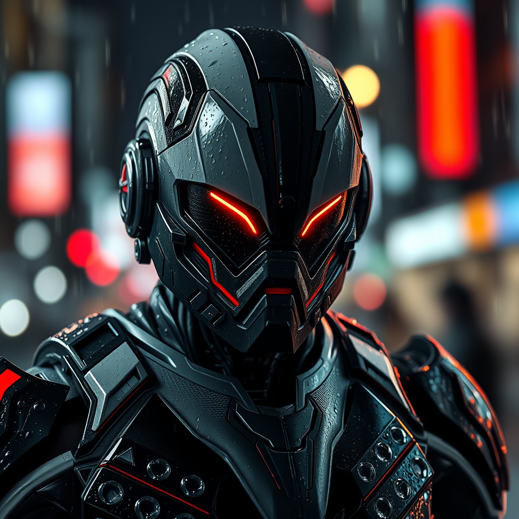 The image captures a close-up of a futuristic humanoid figure, encased in an advanced suit of armor that seamlessly blends cutting-edge technology with sleek design. The armor features a predominantly black and gray color palette, accentuated by striking red and white details that add a bold contrast. Raindrops cling to the surface, glistening under the muted urban lights that form a blurred, colorful backdrop, suggesting a bustling city at night. The helmet is particularly striking, with its intense, red viewfinder-like eyes that convey a sense of precision and focus. The suit's intricate lines and subtle patterns hint at sophisticated technology, offering a glimpse into a world where advanced engineering meets aesthetic finesse. Despite the rain, there is an aura of strength and resilience that emanates from the armored figure, standing as a testament to the seamless fusion of human ingenuity and futuristic vision.