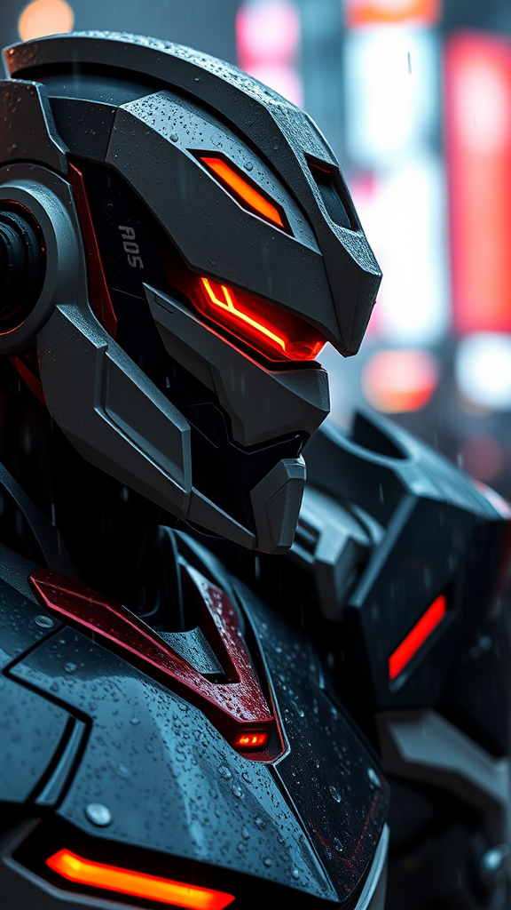The image captures a close-up of a humanoid figure, either a robot or a person clad in an advanced suit of armor, featuring a sleek and polished design with striking red and white accents against a predominantly black and gray base. It's raining, as evidenced by the scattered water droplets on the armor's surface. The armored figure's helmet boasts red, visor-like eyes that convey an intense and focused demeanor. In the background, blurry, colorful lights hint at a bustling urban setting at night. The armor showcases intricate detailing, with complex lines and patterns indicating cutting-edge technology. Small digital readouts can occasionally be seen illuminating beneath the water's surface, adding an element of high-tech sophistication.