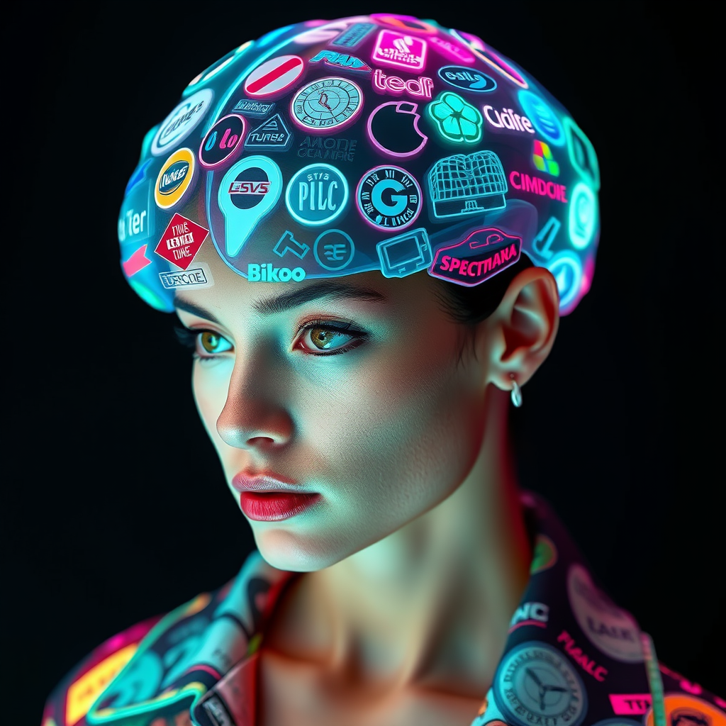 The image captures a highly stylized representation of a brain intricately filled with transparent logos from various sectors such as automotive, food, clothing, technology, beverage, computing, and publishing. These logos seamlessly blend into the brain's design, all rendered in a glowing neon hue that contrasts sharply against the individual's fair skin tone. The person features striking facial characteristics, including a strong jawline, prominent cheekbones, and deep-set eyes. She is adorned in attire with neon patterns that mirror the brain's vibrant theme, enhancing the cohesive visual aesthetic. Her gaze is slightly turned away from the camera, imparting a contemplative and introspective atmosphere. This creation is a piece of art-focused fashion, merging contemporary style with consumer experiences, crafted for a high-fashion editorial. Small creative elements are added while maintaining the essence of the original concept.