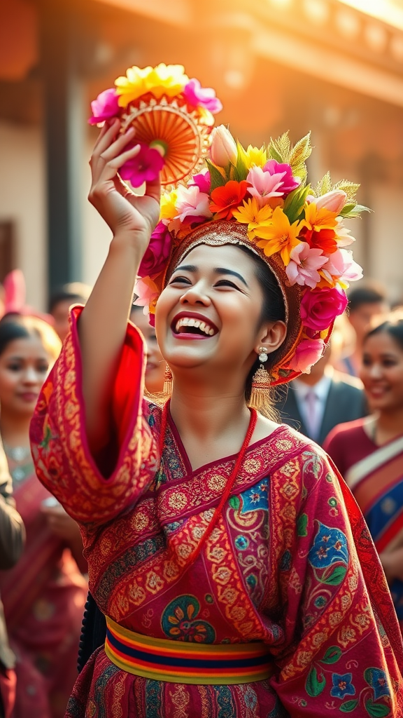 The image captures a joyful moment centered around a radiant woman dressed in vibrant traditional attire, hailing from a culture renowned for its colorful garments. Her outfit is richly adorned with elaborate, colorful patterns and intricate embellishments, and she wears a striking headdress adorned with an array of lush flowers that add a burst of vivid hues to her look. In her hand, she holds up a beautifully crafted artifact toward the sky—a symbol of celebration or festivity—her face alight with unrestrained joy. Her laughter is infectious, eyes squeezed shut, head tilted back in pure delight, showing she is completely absorbed in the merriment. In the softly blurred background, more people dressed in traditional garb join in the celebration, their smiling faces and lively movements indicating a shared cultural gathering. The warm, golden lighting enhances the festive ambiance, imbuing the scene with a lively and vivacious energy.