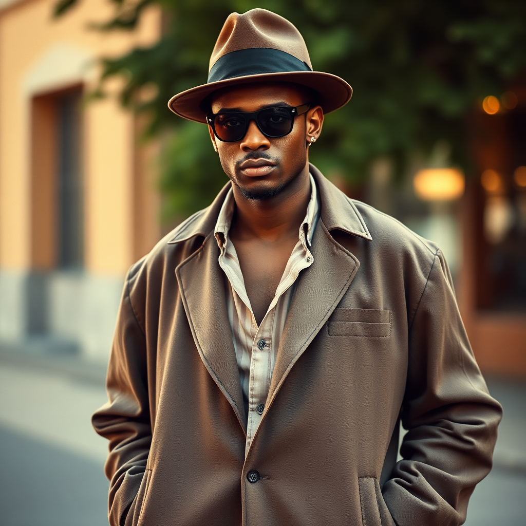 The image captures a man exuding cool confidence, his hands casually placed in his deep pockets. Inspired by the essence of Eugène Brands, this photograph might grace the pages of Instagram, possibly as part of an elegant Dior editorial. With its vintage color palette, the scene evokes the warmth of summertime. The man bears a striking resemblance to Lance Reddick, dressed in oversized attire and topped with a stylish hat, reminiscent of contemporary 2020 fashion trends with a touch of retro flair. The visual style echoes a Hermes advertisement and could easily find its place within a Vogue France lookbook or profile. Influenced by the classic charm of the 1950s, the image may bear the title "Fromme Seele."