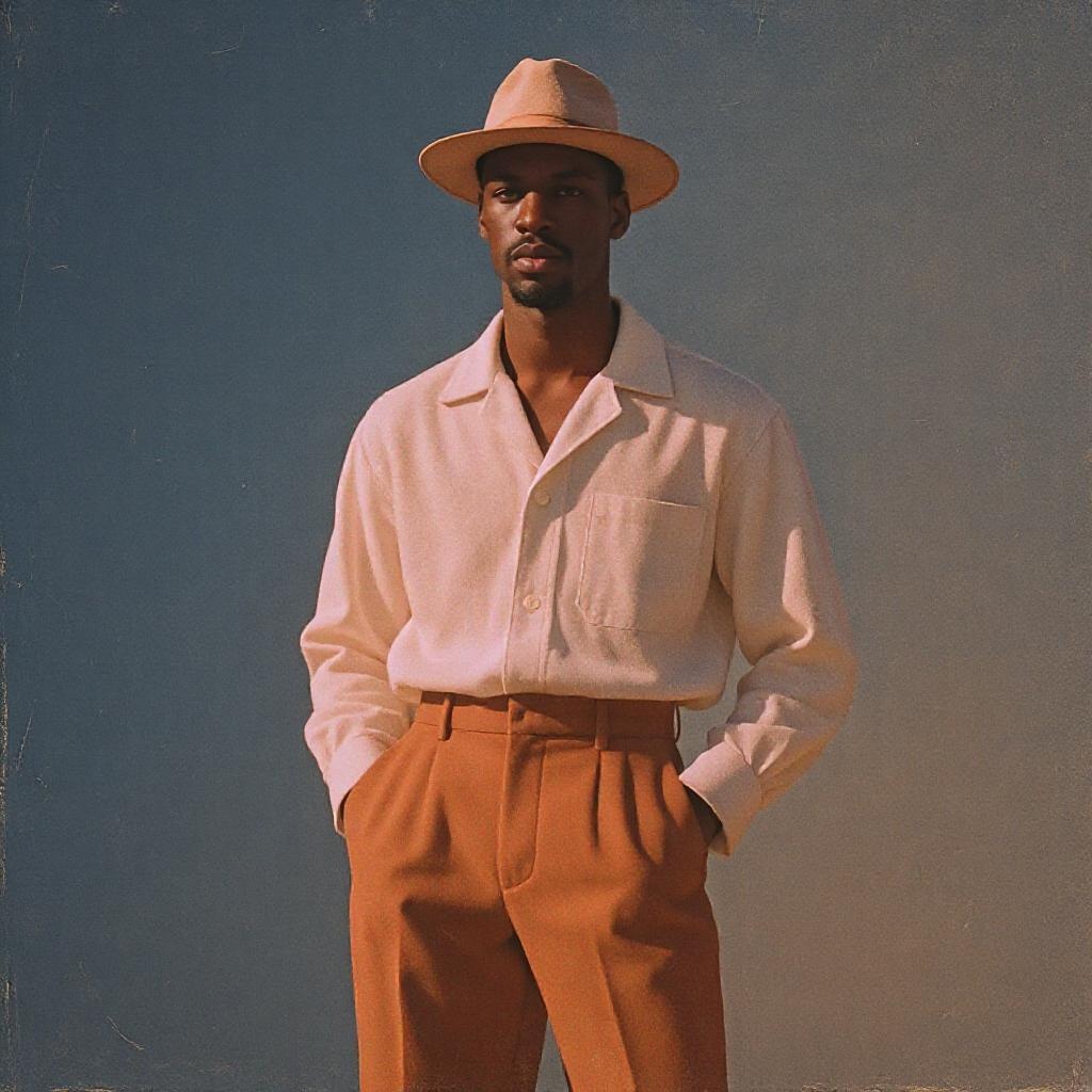 The image captures a man with his hands in his pockets, drawing inspiration from Eugène Brands' artistic flair. This photo, perhaps shared on Instagram, might form part of a Dior editorial collection. It features a nostalgic color palette reminiscent of summer days. The man, whose appearance is similar to that of Lance Reddick, sports loose-fitting attire and a stylish hat. The visual style aligns with that of a classic Hermes advertisement, embodying the essence of 2020 fashion trends. Possibly featured in a Vogue France lookbook or profile, the image carries a distinct 50s influence and could be titled "Serene Soul."