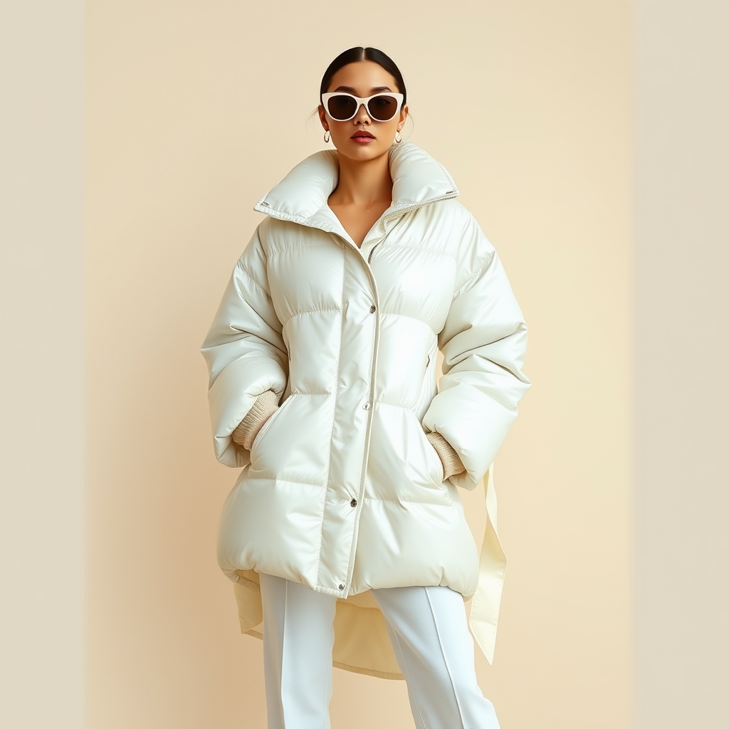The image captures a woman posing against a minimalist beige backdrop, exuding the essence of a Tumblr icon. She's dressed in a chic reflective puffer jacket layered over an elegant poncho, both boasting an off-white palette that speaks to the latest style aesthetics. This ensemble playfully nods to a viral internet trend, making waves on design and architecture platforms like Dezeen. The photo is likely clipped from a 2024 fashion catalog, showcasing trendsetting looks for the year. Her accessories include a sleek mac, trendy 8.0 LV sunglasses, and an intricate folded piece by designers Mike and Wojtek Fus. Altogether, this outfit is a bold statement in contemporary fashion, destined to capture attention.