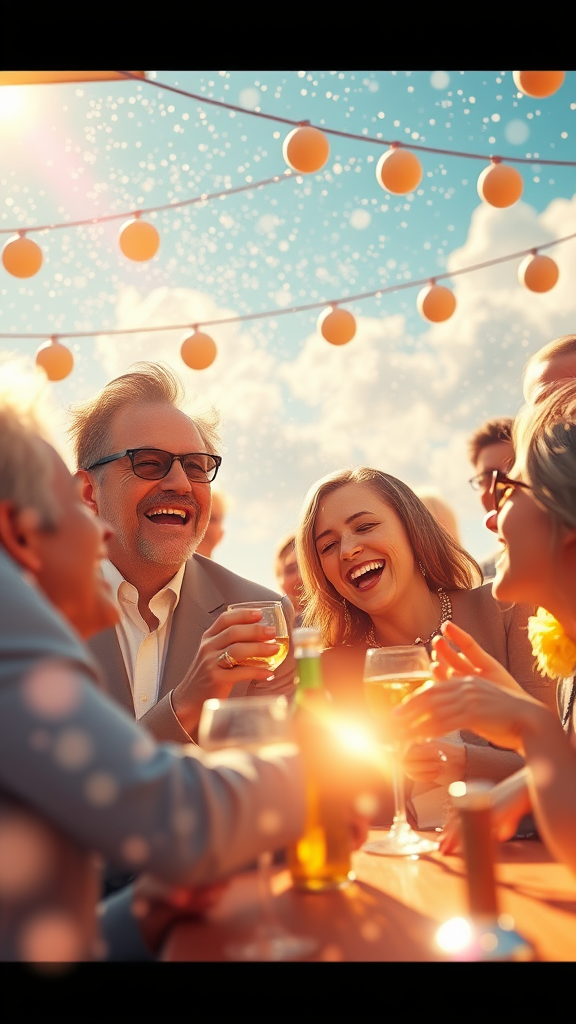 The image captures an awe-inspiring scene that whisks the viewer into a joyful and vibrant world, suffused with laughter and delight. Each element radiates its own exceptional brilliance, as if the details themselves are alive and twinkling. Viewers can almost sense the sound of animated conversations and the clinking of glasses, while feeling the calming warmth of the sun and a gentle breeze playing through their hair. This epic creation is a triumph of artistic expression, leaving those who gaze upon it feeling elated, motivated, and thoroughly entranced by its striking beauty and inventive originality. A digital masterpiece rendered in meticulous 3D using high-quality techniques to bring this enchanting vision to life.