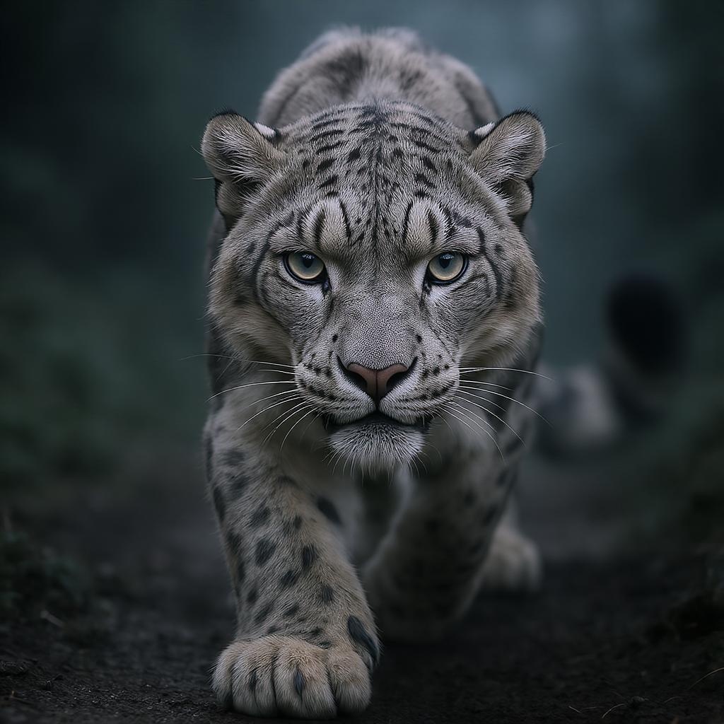 The image captures an intense close-up of a snow leopard prowling forward, its gaze locked with the viewer in a commanding presence that fills the frame. The scene exudes an undeniable aura of graceful strength. The leopard's sleek, wet fur clings to the contours of its rippling muscles, accentuating its raw power and fluid motion. Its large paws tread silently on the earth, embodying a restrained, lethal energy with every step. A soft, ambient light bathes the setting, casting a luminous sheen that enhances the mysterious and tranquil vibe. The blurred background suggests a cool, misty forest, ensuring the snow leopard remains the focal point. The composition strikes a haunting balance between stunning beauty and quiet menace.