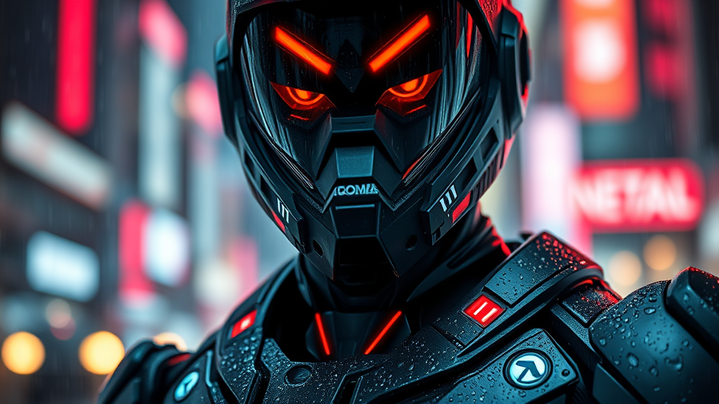 The image depicts a close-up of a humanoid figure clad in an advanced suit of armor, which exudes a sleek and modern aesthetic. The design incorporates red and white highlights set against a predominantly black and dark gray backdrop. It is clearly raining, as the surface glistens with water droplets. This figure, either a highly sophisticated robot or a person encased in futuristic armor, showcases a helmet with piercing, ruby-red, visor-like eyes, creating an intense, focused gaze. The background hints at a vibrant cityscape at night, with blurred neon lights adding to the futuristic atmosphere. The armor features finely etched lines and complex patterns, signifying cutting-edge technology, while a subtle blue glow emanates from certain parts of the suit, enhancing its high-tech appearance.