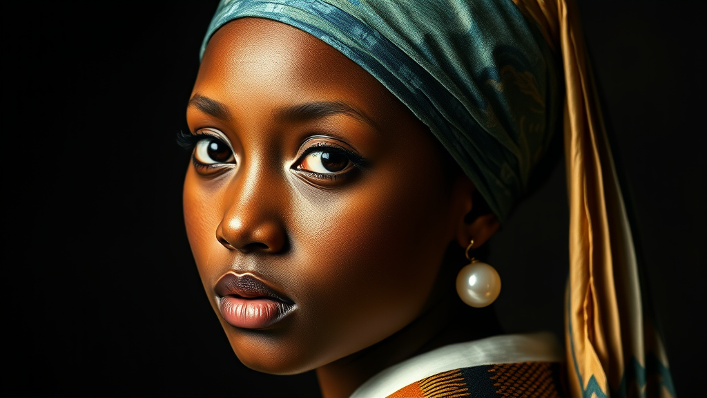 The image depicts an Afro-American interpretation of "Girl with a Pearl Earring" by Johannes Vermeer. The girl showcases a captivating presence with a green headband and rich brown skin, enveloped in award-winning studio lighting that highlights her serene expression. The high-resolution 8k image incorporates vibrant African-inspired patterns subtly infused into her attire, adding a contemporary twist to the classical composition while maintaining its timeless elegance.