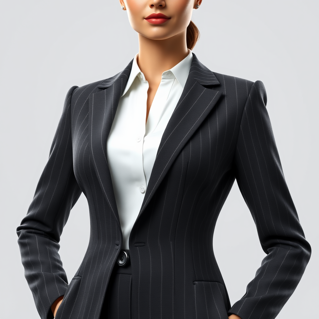 The image draws you in with the commanding presence of an extraordinary female business leader. She stands confidently in a flawlessly crafted, custom-tailored suit that highlights her strong silhouette, merging elegance with power. The suit's material is a refined blend of premium wool and silk, featuring a delicate pinstripe pattern that enhances its elegance. Her jacket fits with precision, boasting a sleek lapel and a trio of buttons that subtly accentuate her waist. This visual is reminiscent of a CGI rendition, capitalizing on 3D doll-like aesthetics, rendered using octane for a lifelike yet slightly stylized look. Despite its digital creation, the image avoids common pitfalls like low resolution, distorted text, and visual errors, achieving an impeccable depiction without flaws such as duplicated or disfigured features. The composition is complete, with ideal proportions and clarity, ensuring an inspiring portrayal of professional poise and grace.