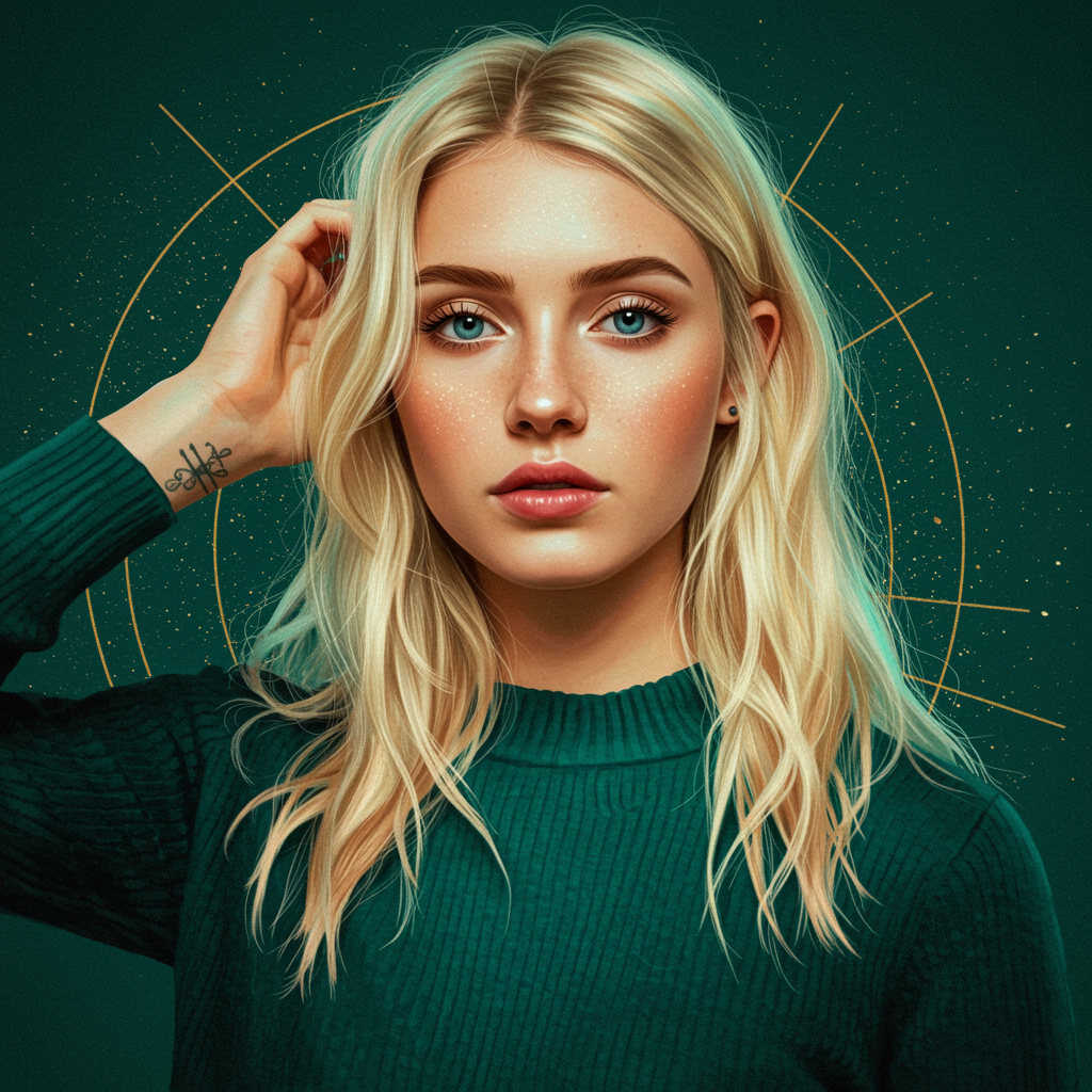 The image features a blonde woman showcasing a variety of clothing styles, depicted in hues of deep aquamarine and pale amber. The artwork presents prismatic portraits in a stunning 8k resolution, blending multiple artistic styles harmoniously. The influence of Whitcomb-girls is evident, creating an atmosphere of ethereal beauty with golden illumination. Elements of celebrity figure combinations are skillfully integrated, maintaining a raw yet refined aesthetic with a distinct mashup of cultural influences.
