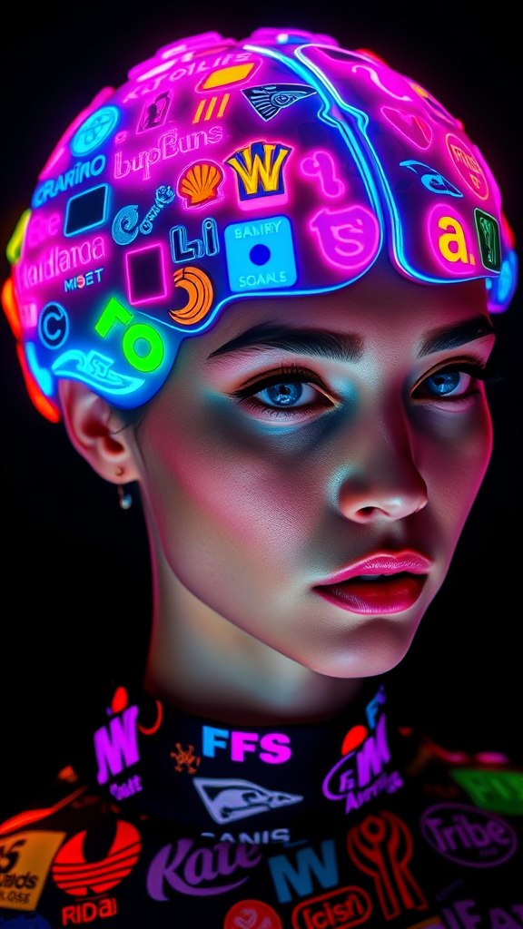 The image features a striking and stylized representation of a brain filled with translucent logos of prominent car, food, clothing, technology, beverage, computer, and publishing brands. These logos are intricately distributed across the brain's surface, seamlessly blending into one another. The design is rendered in vibrant neon colors that stand out against the individual's fair complexion. The person is characterized by defined facial features, including a strong jawline, high cheekbones, and captivating, deep-set eyes. She sports clothing adorned with neon designs that complement the brain's luminous theme. Her gaze, directed slightly off-screen, imbues the image with a sense of introspection. This brain design serves as a piece of avant-garde fashion, merging contemporary style with elements of consumer culture, crafted for a haute couture editorial setting. The overall effect is a fusion of modern aesthetics and brand-driven identity, set against a thoughtful, contemplative backdrop.