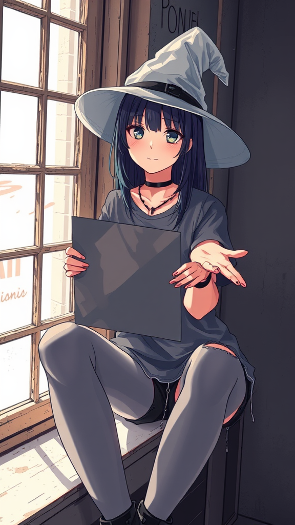 The image features a stunning illustration of a woman with a punk-inspired style, sitting by a window in an antiquated room. She holds a thin sheet of metal in her outstretched hands, adorned with a punk-style T-shirt and cute, ripped leggings. Her ensemble is completed with a translucent witch hat, adding an enchanting flair. The setting is captured in a model shoot style, showcasing high saturation and emphasizing the female angelic aura with her sweet, anime-like facial features and a pretty face adorned with a sheer blush cheek. The focus is on her alone, bathed in volumetric lighting, creating a captivating and vibrant atmosphere. This beautiful illustration rendered in 8K truly highlights her casual yet striking punk attire, infused with an ethereal charm.