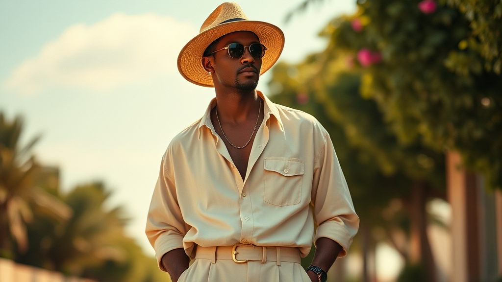 The image illustrates a man exuding timeless elegance, his hands nonchalantly tucked in his pockets. Drawing inspiration from the carefree spirit of Eugène Brands, this photograph radiates a retro summer vibe, with colors dancing in nostalgic hues. The man, reminiscent of Lance Reddick, dons loose-fitting attire and a stylish hat, embodying the laid-back sophistication of 2020 fashion reminiscent of a Hermes advertisement. His ensemble and posture hint at a 50s influence, blending seamlessly with the contemporary flair of a Dior editorial. The image, ideally curated for a Vogue France lookbook, might be aptly titled "Gentle Soul," capturing the essence of refined tranquility.
