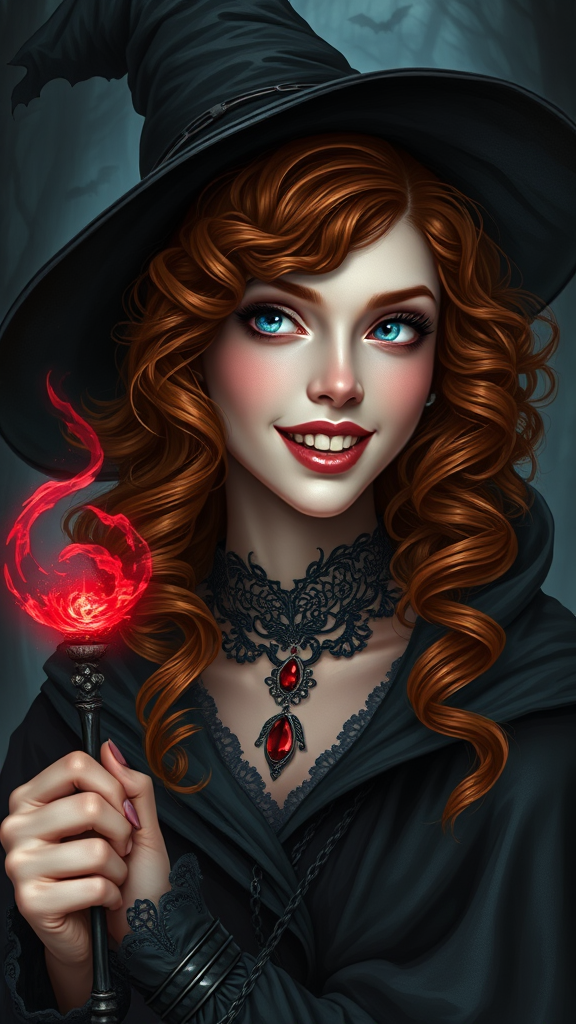 The image is a digital fantasy artwork showcasing a witch with captivating features. The subject is a woman with alabaster skin and fiery red hair cascading in wild curls. She dons a traditional black witch's hat and a dark cloak adorned with delicate lace trim. Her eyes are a brilliant, luminescent blue, and her smile reveals sharp, elongated fangs. She grips a wand that emanates a swirling red magical aura in her right hand. Adorning her neck is an intricately crafted black choker, featuring a gleaming ruby pendant. The backdrop is a dim, mist-laden forest with shadows of fluttering bats, enhancing the mystical and otherworldly ambiance. The color scheme is rich with dark hues and crimson highlights, accentuating the enchanting supernatural essence of the piece.