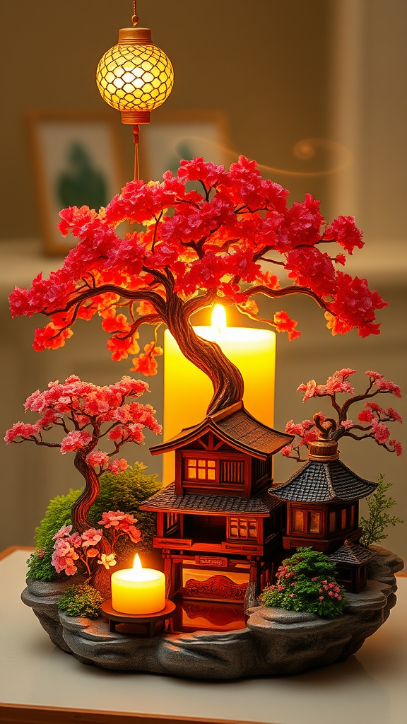The image portrays a beautifully intricate candle holder designed as a miniature landscape. At its heart stands a majestic tree with vibrant crimson blossoms, crafted from tendrils of luminous mist swirling elegantly. The base features a cluster of small structures mirroring traditional East Asian architecture, complete with gracefully curved roofs and wooden facades, warmly illuminated by light glowing through their windows. Nestled behind this enchanting scene is a large, creamy candle. Encircling the centerpiece, smaller trees with delicate pink flowers rise amidst lush greenery, offering a stunning contrast. In front of one building, a gently flickering candle rests within a serene pool, its reflections dancing across the surface to enhance the tranquil ambiance. An ethereal golden lantern hovers above, casting a gentle glow over the composition. This artful fusion exhibits a seamless blend of natural beauty and cultural symbolism, conjuring a sense of peace and elegance reminiscent of timeless Chinese gardens.