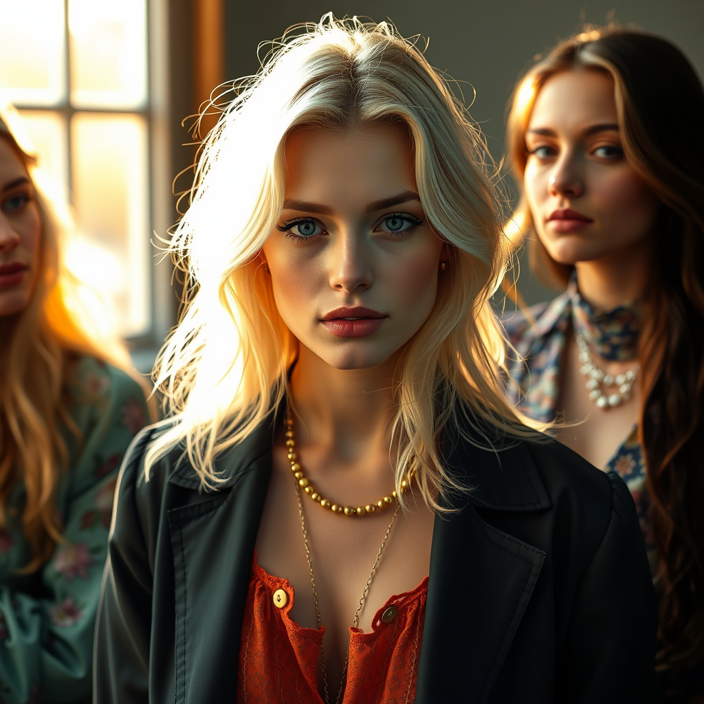 The image portrays a blonde woman adorned in various outfits, showcasing a blend of dark aquamarine and soft amber tones. The composition features prismatic portraits with an 8k resolution, merging diverse styles and inspired by Whitcomb-Girls. Illuminated by a warm, golden light, the image represents a fusion of celebrity portraits, capturing a vibrant and dynamic essence. The aspect ratio is 2:3, with a focus on natural textures and intricate details.
