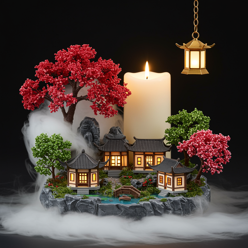 The image portrays a delicately crafted candle holder designed like a miniature landscape scene. At its heart, a majestic tree with deep crimson blossoms stands tall, appearing as though fashioned from swirling white mist. The base of the structure supports several small buildings reminiscent of traditional East Asian architecture, complete with gracefully curved roofs and elegantly crafted wooden elements, illuminated by the warm glow of lights within their windows. Behind this enchanting diorama sits a large, ivory candle. Encircling these primary elements are various smaller trees, adorned with soft pink blossoms that offer a vibrant contrast to the predominantly verdant foliage. In front of one peaceful building, another candle burns gently within a pond, creating a reflective surface that enhances the scene's serenity. Hanging above, a prominent golden lantern emits a soft, ambient light, bathing the entire setup in a gentle luminescence. This composition weaves together nature-inspired artistry and rich cultural symbolism, evoking the tranquility and beauty found in traditional Chinese gardens.