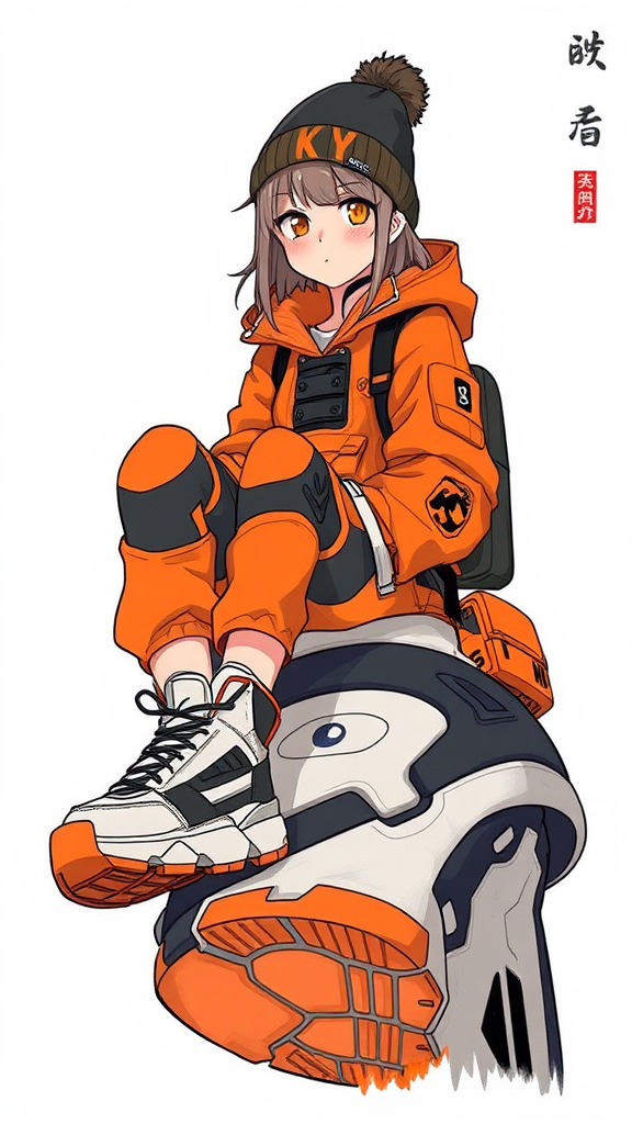 The image portrays a girl perched on a large pair of sneakers, rendered in an anime drawing style, and posted on Tumblr. The artwork incorporates elements of ukiyo-e art, blending traditional Japanese aesthetics with a modern twist. The girl sports a beanie and a hoodie, paired with work clothes that exude a techwear vibe, reminiscent of Tsutomu Nihei's distinct style. Her face is adorably anime-like, yet her attire reflects a professional sports theme, complete with high-tech sneakers. The color palette of the image is dominated by vibrant shades of orange and black, creating a striking contrast. The piece is signed by the artist, Mike.