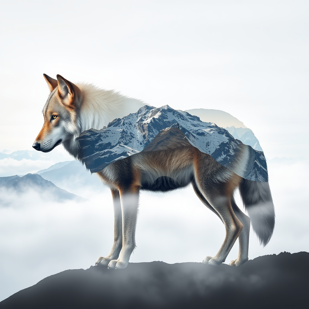 The image portrays a mesmerizing fusion of natural elements where the outline of a wolf is artfully overlapped with a mountain landscape. The wolf, captured in a poised stance, displays a blend of textures from its fur and the rugged terrain that fills its form, creating a double exposure effect. This artistic composition merges the earthy tones of the wolf's coat with the muted hues of the snow-capped peaks, predominantly whites, blues, and grays, suggesting an intrinsic connection between the wildlife and its habitat. A delicate essence permeates the image, conveyed by the soft drifting mist and the serene backdrop of the horizon, which establishes a peaceful mood. This image evokes a sense of the wolf's integration within and as a part of the majestic mountainous landscape it roams, emphasizing a bond between the animal and its natural domain.