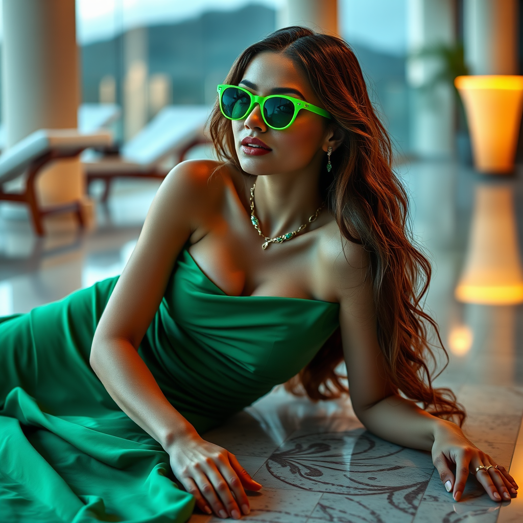 The image portrays a woman gracefully seated on the floor, draped in an exquisite emerald gown. The scene exudes the essence of an album cover, reminiscent of Elsa Bleda's signature style. Adorning her eyes are chic Ray-Ban spectacles and striking neon sunglasses, which inject a vibrant flair to her ensemble. The skintight dress showcases a fashionable color-blocking design, a contemporary trend in fashion. This elegant gown perfectly suits a sophisticated lounge setting, with the model accentuating her look with green-hued jewelry. The photograph, expertly captured by the gifted artist Julian Ope, seems to be set in an upscale resort. The woman bears an uncanny resemblance to the singer Dua Lipa or the actress Stoya.
