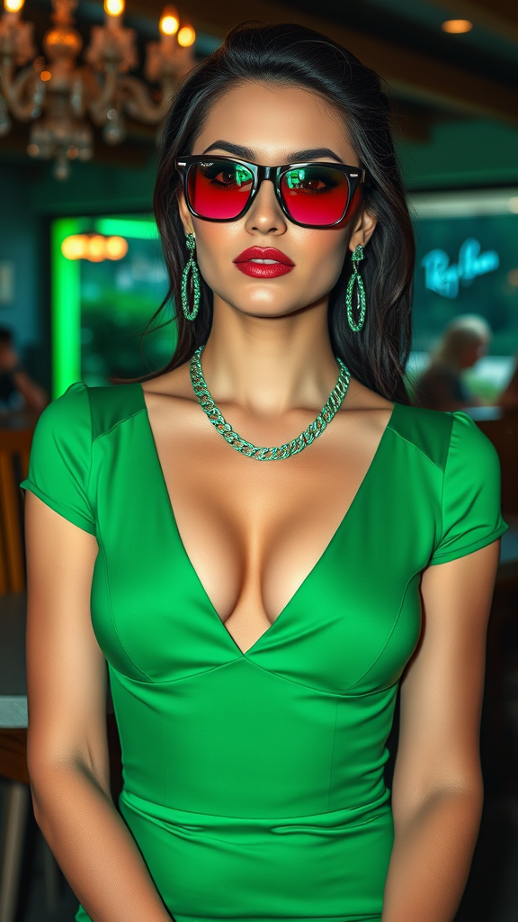 The image presents a striking woman in an elegant emerald dress, exuding chic album cover vibes reminiscent of the style of photographer Elsa Bleda. She sports a pair of iconic Ray-Ban glasses paired with vivid neon sunglasses, adding a vibrant contrast to her sophisticated ensemble. The dress, a form-fitting piece with modern color blocking, beautifully complements the setting of an upscale lounge. Adding to her allure, the woman is adorned with matching emerald jewelry that enhances the dress's rich tones. The photo, snapped by the gifted photographer Julian Ope, was likely taken at a luxurious resort. The subject's features evoke a likeness to either pop star Dua Lipa or enigmatic actress Stoya.