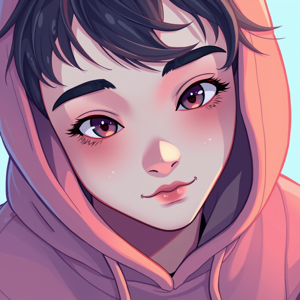 The image showcases a close-up of an individual in a hoodie, drawing inspiration from the digital artistry of Yanjun Cheng, Beeple, Rhads, and Lois van Baarle. The illustration is cartoon-like, embracing vibrant pastel hues which come together to form a stunning piece reminiscent of a retro anime aesthetic. Subtle creative twists include playful expressions and soft lighting, enhancing the whimsical charm of the scene.