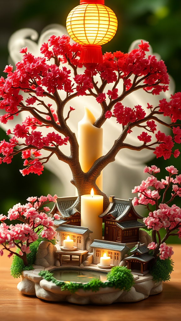 The image showcases a delicately crafted candle holder that resembles a miniature landscape scene. At the heart of this exquisite piece is a majestic tree, its branches bursting with deep crimson blossoms, appearing as though formed from ethereal white mist swirling gracefully around it. The base of the structure is adorned with several petite edifices, drawing inspiration from traditional East Asian architecture, featuring elegantly curved roofs and wooden structures bathed in the warm glow of light streaming through their windows. Nestled behind this intricate diorama is a prominent cream-colored candle. Encircling these central elements are various smaller trees with soft pink flowers, introducing layers of depth and providing a vibrant contrast to the lush green foliage. One of the buildings has a small lit candle set in what looks like a serene pond, its reflections dancing on the water’s surface to enhance the tranquil ambiance. Above the entire scene hangs a distinctive orange lantern, shedding a gentle ambient light that envelops the setup. This ensemble achieves a harmonious blend of nature-inspired artistry and cultural symbolism, echoing the peaceful beauty reminiscent of traditional Chinese gardens.