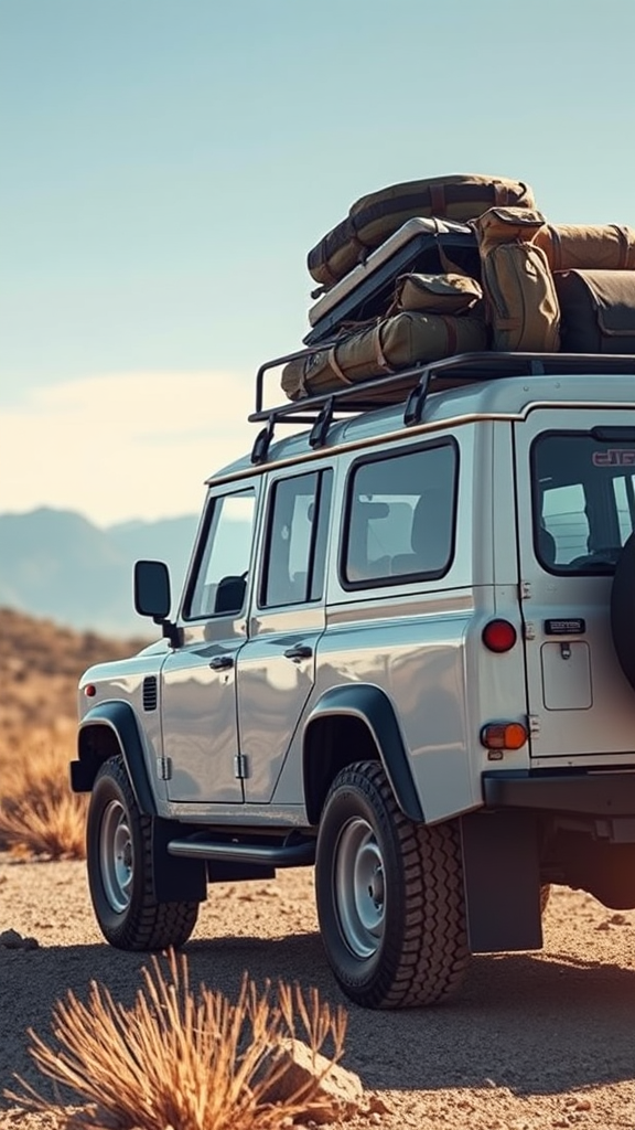 The image showcases a detailed portrait of a white SUV, prominently featuring a roof rack laden with travel gear, suggesting a journey into the wilderness. The scene evokes the mastery of Renaissance art, while the SUV's hyper-realistic portrayal hints at the style associated with photography and renderings from the late 20th century. The SUV, reminiscent of the classic Discovery One model from the 90s, is captured in a pristine, clear backdrop that accentuates its sleek design. The ambiance is fueled by an adventurous spirit, where the vehicle appears mid-journey, angled slightly to highlight its robust character and exploration prowess. This creation might be seen as a tribute to a significant milestone or celebration, its vivid depiction rendered possibly through a Polaroid octane process, bestowing it a timeless quality. Its presentation in a 16:9 aspect ratio makes it an exceptional piece for wall display, symbolizing a significant icon in the realm of adventure vehicles.