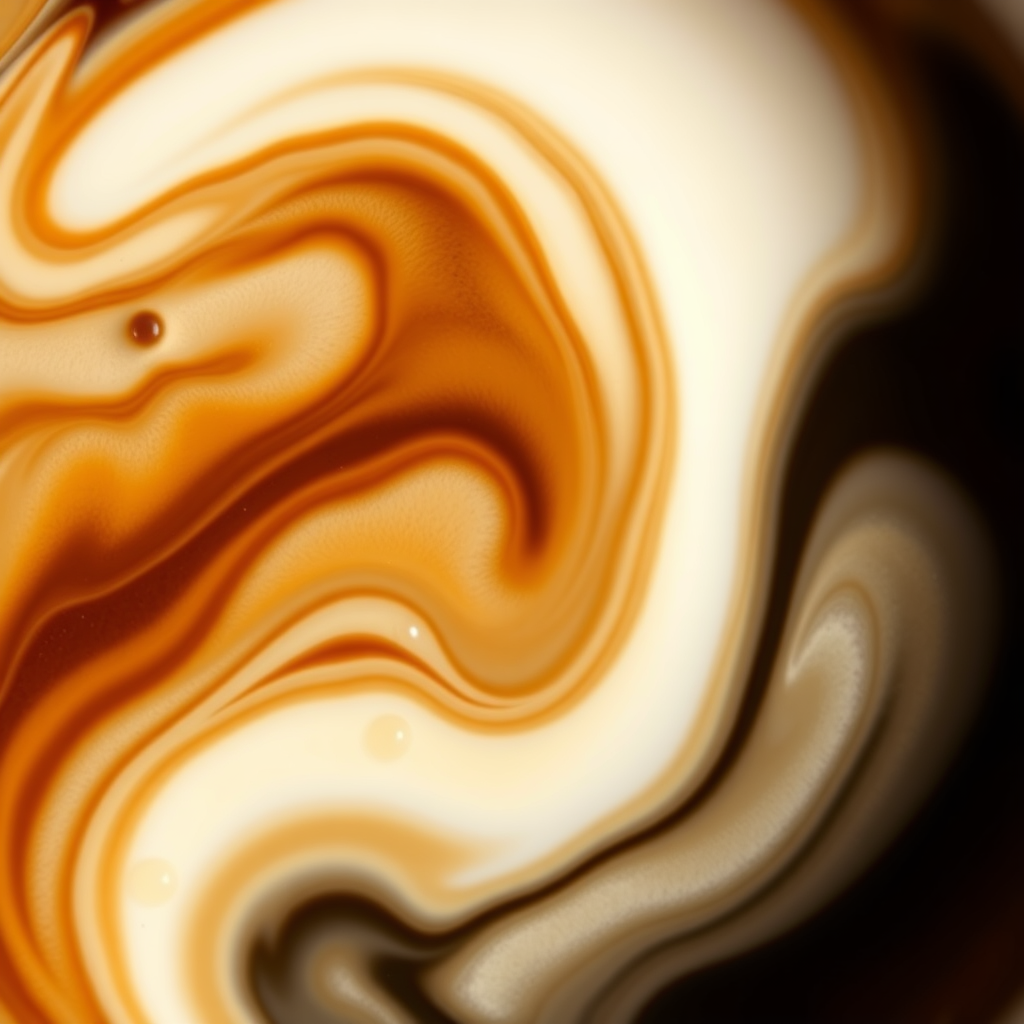 The image showcases a dynamic dance of swirling coffee and cream within a cup. The suspended droplets and the intricate blend of rich, dark coffee hues with the soft, creamy tones create a captivating visual that beautifully captures the graceful interaction and contrast between the two liquids.