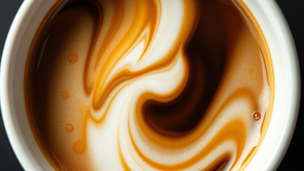 The image showcases a dynamic swirl of coffee and cream within a cup. The floating droplets and the seamless dance of light and dark tones craft a captivating visual that highlights the graceful interaction and contrast between the two liquids.