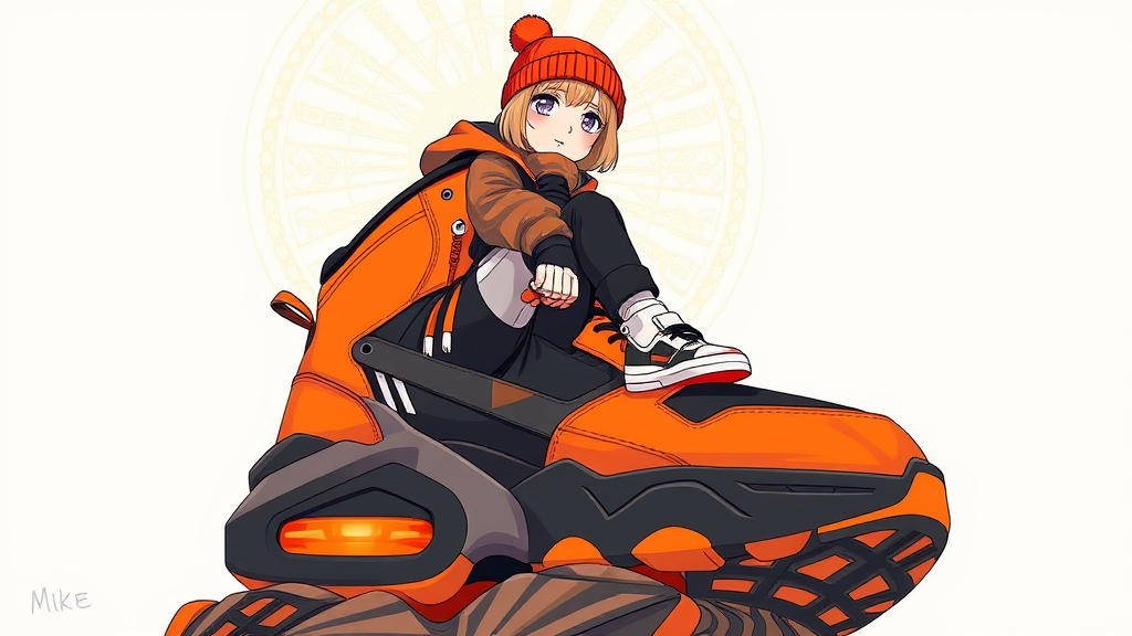 The image showcases a girl perched atop an oversized pair of sneakers, rendered in a vibrant anime drawing style. Posted on Tumblr, this artwork blends traditional ukiyo-e influences with a contemporary twist. The girl, with her irresistibly cute anime-like face, dons a stylish beanie and hoodie, complemented by work clothes that embody a futuristic techwear aesthetic. The ensemble echoes a professional sports vibe with sleek, high-energy design elements. The color palette is dominated by bold oranges and deep blacks, adding a striking contrast to the piece. The artwork exudes a fusion reminiscent of Tsutomu Nihei's distinctive style. This captivating creation bears the signature of the artist, Mike.