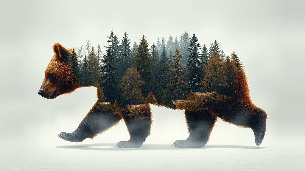 The image showcases a mesmerizing fusion of natural elements, where the outline of a bear is artfully merged with a forest scene. The bear, caught in mid-stride, blends textures from its fur with the trees that populate its form, creating a striking double exposure effect. This artistic piece marries the earthy hues of the bear's coat with the muted colors of a frosty forest, primarily featuring whites, browns, and grays, symbolizing the intrinsic link between the creature and its surroundings. The image exudes a gentle calmness, accentuated by softly falling snow and a misty backdrop, creating a serene ambiance. The artwork encapsulates the essence of the bear existing within and as part of the woodland landscape it roams, emphasizing the interconnectedness of wildlife and environment.