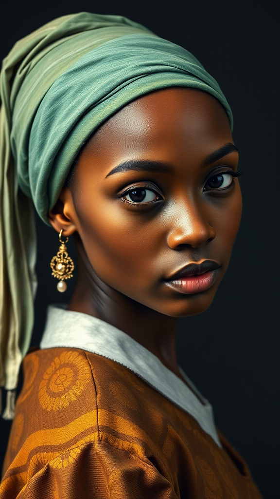 The image showcases a reimagined version of "Girl with a Pearl Earring" by Johannes Vermeer, featuring an Afro-American girl. She wears a green headband and displays beautifully rich brown skin. The artwork captures award-winning studio lighting in high resolution 8k, highlighting an African-inspired style. Her ears are adorned with unique, intricate jewelry that subtly echoes the original pearl, and her expression exudes a blend of mystery and grace. The background is a deep, rich hue that contrasts elegantly, drawing focus to her captivating gaze and the harmonious blend of traditional and contemporary elements.