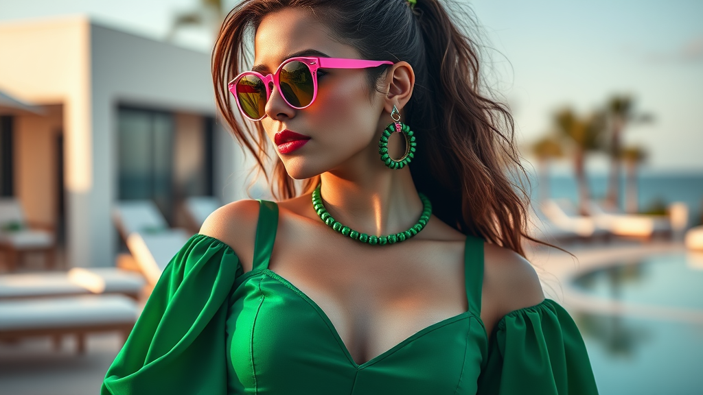 The image showcases a woman in a striking emerald dress, reminiscent of an album cover, possibly drawing inspiration from photographer Elsa Bleda. She accessorizes with a stylish pair of Ray-Ban glasses and vibrant neon sunglasses, adding a splash of color. Her dress, form-fitting and utilizing trendy color blocking, is ideal for a chic lounge setting. The model enhances her look with matching green jewelry. Captured by the skilled photographer Julian Ope, the backdrop suggests a luxurious resort. The woman resembles either musician Dua Lipa or actress Stoya.