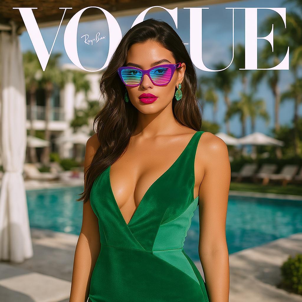 The image showcases a woman in a stunning emerald dress, reminiscent of an album cover style, possibly drawing inspiration from Elsa Bleda's photography. She accessorizes with Ray-Ban eyeglasses and vibrant neon sunglasses, adding a touch of color to her ensemble. Her figure-hugging dress features trendy color blocking, making it ideal for a chic lounge setting. Complementary green jewelry enhances her look. Captured at a luxurious resort by the gifted photographer Julian Ope, the woman resembles either the musician Dua Lipa or actress Stoya.