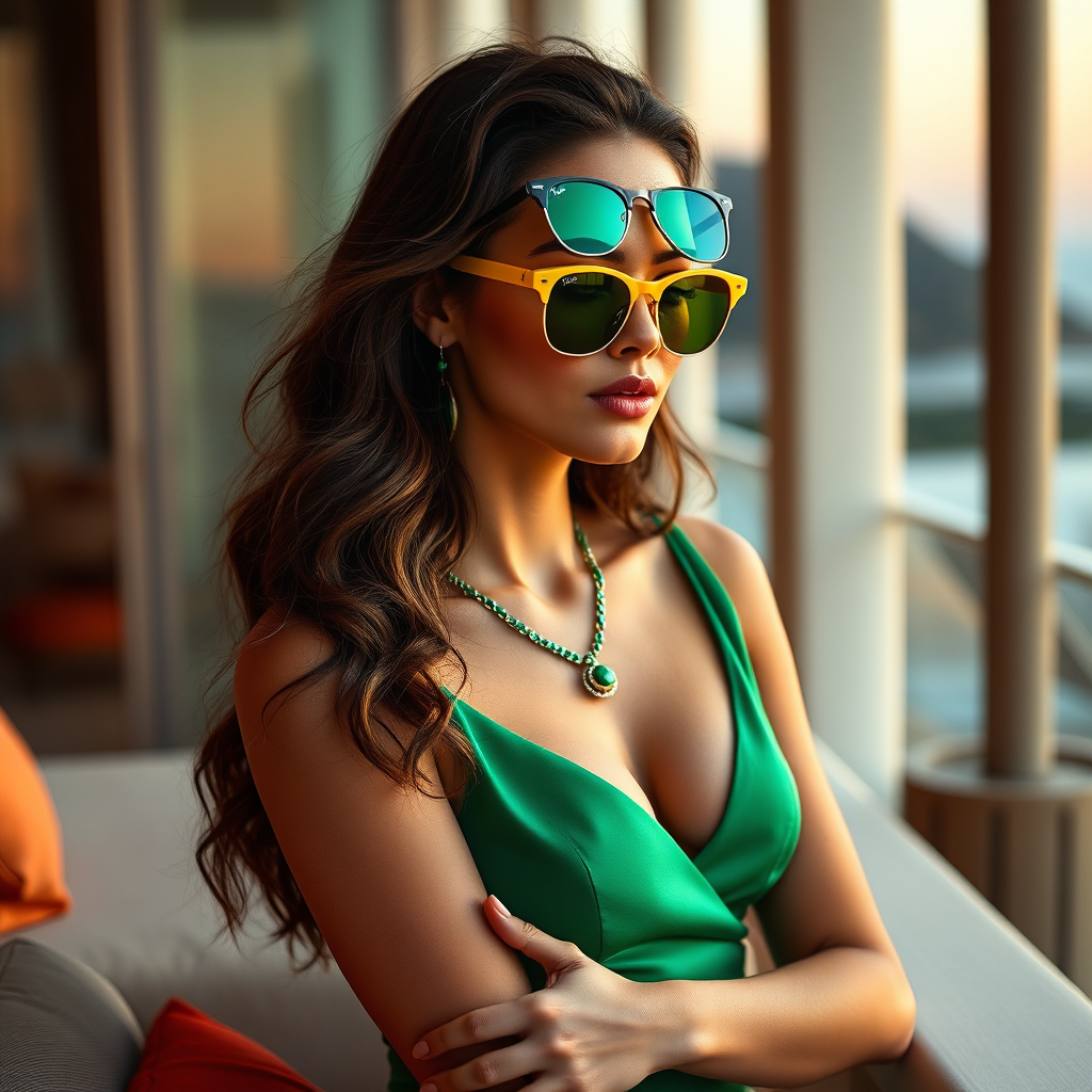The image showcases a woman in an exquisite emerald dress, seemingly styled for an album cover with nods to the evocative photography of Elsa Bleda. She accessorizes her look with Ray-Ban spectacles alongside playful neon-tinted shades, injecting a vibrant contrast into her ensemble. The dress, which hugs her figure, demonstrates an artful use of color blocking, a fashionable design element. Ideal for a sophisticated lounge setting, her attire is accentuated with matching green jewelry. The picture, likely captured at a luxurious resort, is the work of the skilled photographer Julian Ope. The woman in the photo bears a striking resemblance to the likes of music sensation Dua Lipa or actress Stoya.
