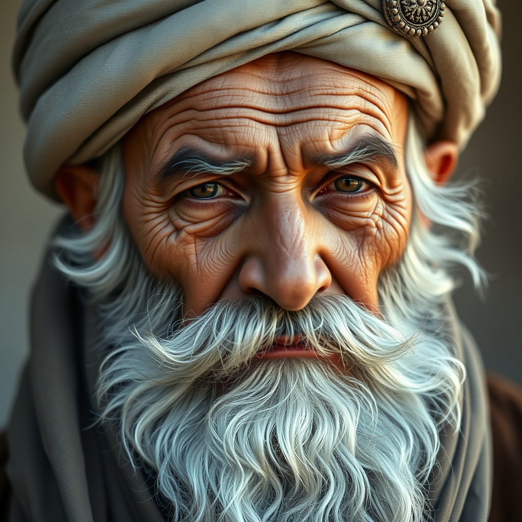 The image showcases an elderly gentleman with a flowing silver beard and mustache, adorned with an ornate turban. His face is marked with deep lines of wisdom and experience, and he carries an imposing yet insightful expression. The man's beard and mustache command attention, enhancing his dignified presence. The close-up of his face highlights the depth of his gaze and the gravity in his features.