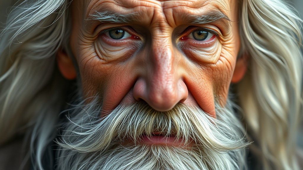 The image showcases an elderly gentleman with a flowing silver beard and mustache, exuding an air of wisdom and authority. His piercing eyes and furrowed brow convey a lifetime of experiences, while his well-groomed facial hair enhances his dignified presence. The portrait's tight focus on his expressive features highlights the depth and intensity of his gaze, hinting at countless stories untold.