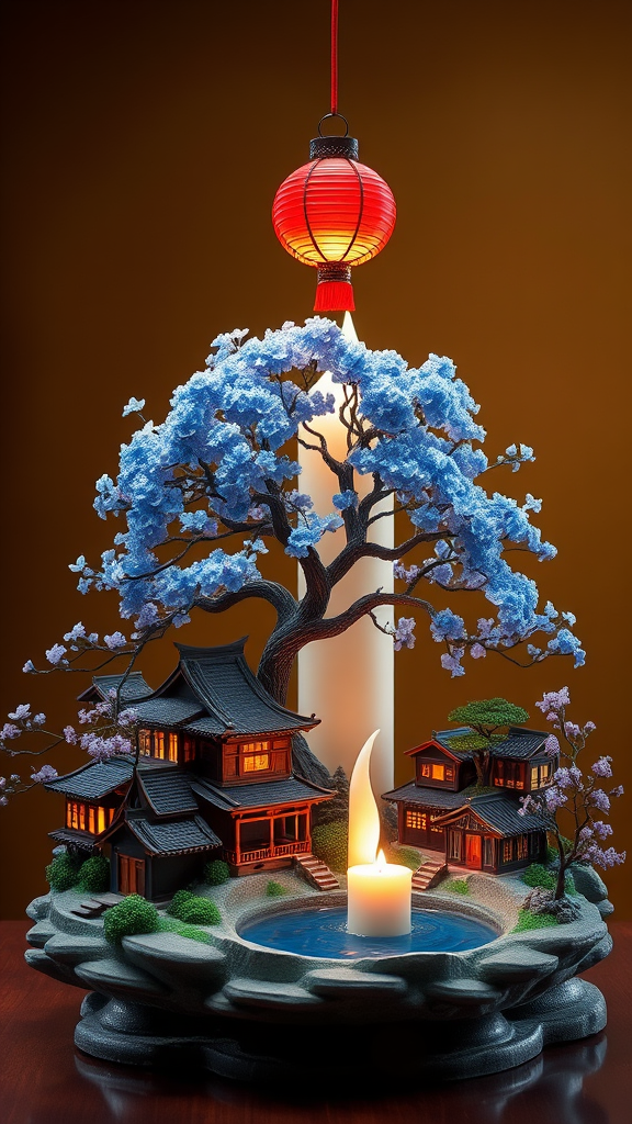 The image showcases an intricately crafted candle holder designed to resemble a miniature landscape. At the heart of this creation stands a grand tree with vibrant azure blossoms, appearing to be formed from swirling silvery mist. The base features an array of tiny structures mimicking traditional East Asian architecture, complete with gracefully curved roofs and wooden facades illuminated by a warm glow emanating through their windows. An elegant ivory candle stands softly behind the scene. Surrounding the centerpiece are smaller trees adorned with delicate lavender blossoms, offering depth and contrasting hues against the verdant foliage. In front of one building sits another lit candle, nestled within a crystalline body of water, creating serene reflections. Above all, a prominent crimson lantern is suspended, casting a gentle ambient light across the composition. This masterpiece harmoniously intertwines natural beauty with cultural symbolism, evoking a tranquil ambiance reminiscent of classical Chinese gardens.